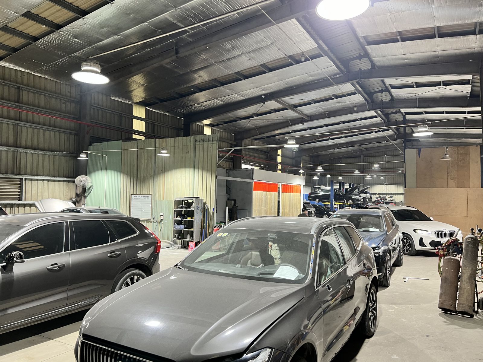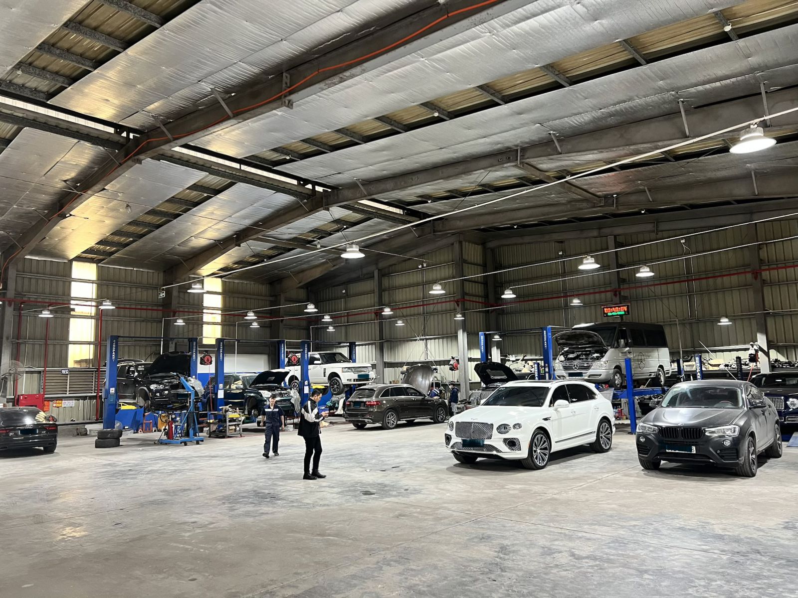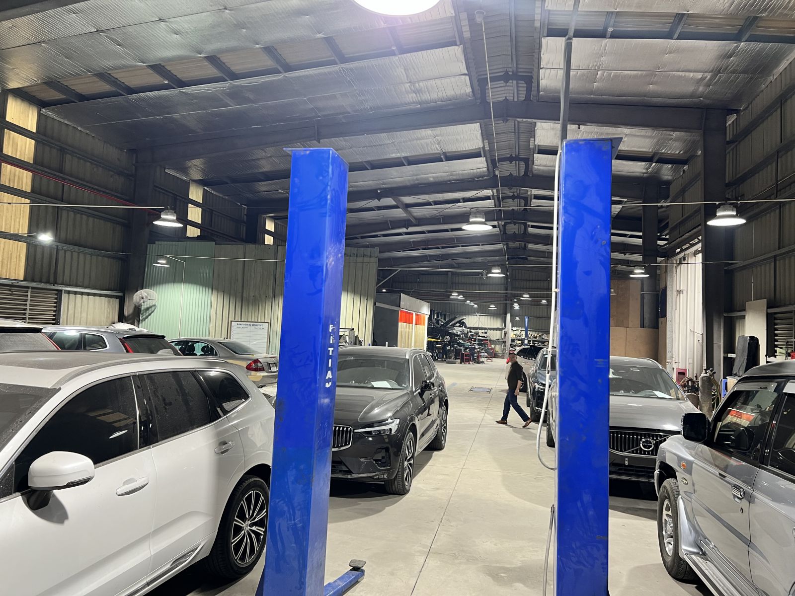 Bước vào xưởng sửa chữa, điều đầu tiên đập vào mắt là không gian rộng rãi, được bố trí khoa học. Các dãy xe đậu ngay ngắn trên hệ thống cầu nâng thủy lực, mỗi chiếc xe đang được kiểm tra và sửa chữa với sự tập trung cao độ của đội ngũ kỹ thuật viên. Tiếng máy móc, tiếng dụng cụ va chạm vang lên đều đặn tạo nên một bầu không khí lao động sôi động.